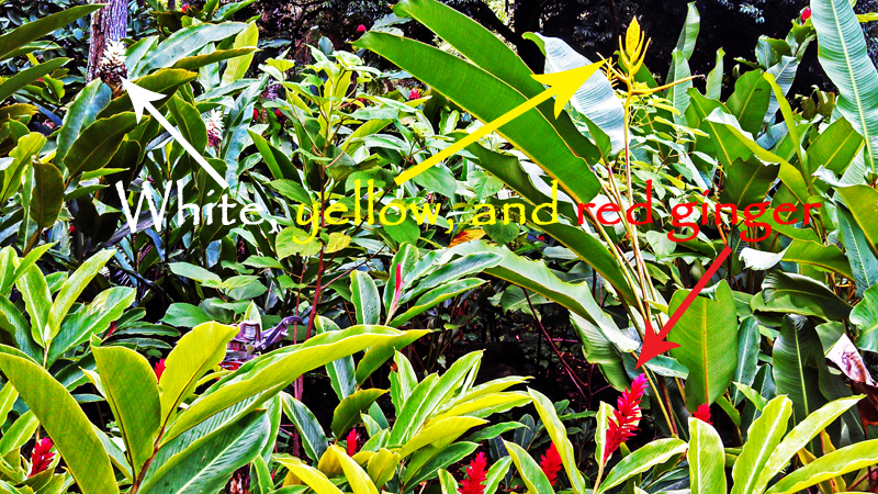 planted with rain forest trees and shrubs from the tropics of the world. In the first few minutes of our two-hour walk, Carol pointed out the drooping remnants of tumeric plants near the park entrance. She then reached into the dirt, pulled up a tuber–thinner than the ginger root one finds at a supermarket, and broke it apart. “Smell it,” she directed. It was a lighter, fresher version of the powder I have in a jar at home. The juice is bright yellow; Gary rubbed it on a fresh bruise on his arm: it was almost gone the next day. I think I’ll take the rest home with me.