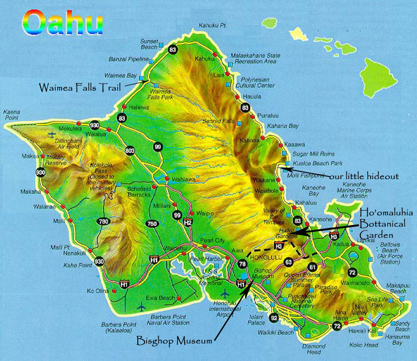 on James Michener’s Islands of the South Pacific and Australia’s Great Barrier Reef, where we reveled in irresistible underwater vistas. This year we’ve come to the north-east shore of Oahu, snorkeling gear in tow, and found ourselves caught up by the color, texture, and sheer exuberant energy of vegetation thriving in lush valleys separated by sharp volcanic partitions.