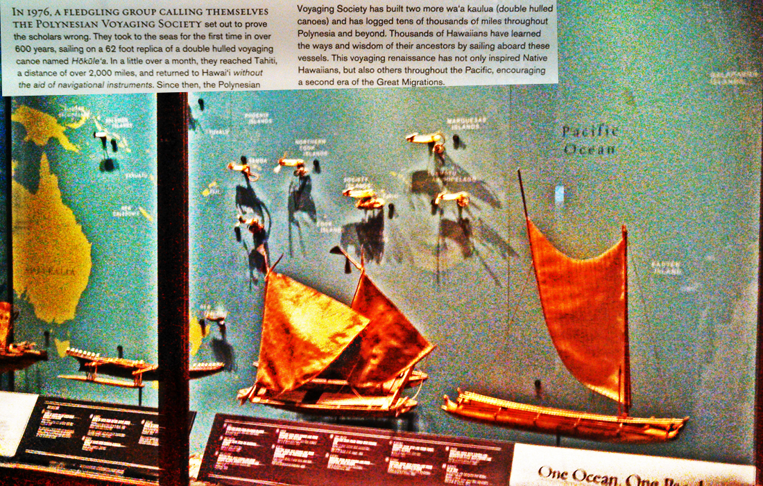 We visited the Bishop Museum the next day, where we spent hours engrossed in the history of Hawaii. The ground-floor display of sailing canoes harked back to another book by Michener: Hawaii, published in 1959. I didn’t read the book until 1999, but I loved the story of Polynesians sailing thousands of miles, guided by sun and stars until they found fertile and receptive islands on which they settled. In 1976, the Polynesian Voyaging Society went from Hawaii to Tahiti and back–over 2,000 miles each way, in a replica of an ancient sailing canoe without navigation instruments, demonstrating the veracity of the legend that Michener recounted. This and subsequent voyages cemented bonds between Hawaii, the Marquesas, Fiji, Tonga, Tahiti, Tonga, and Aotearoa (which I know as New Zealand) as members of the great Pacific triangle of the Polynesian Islands.