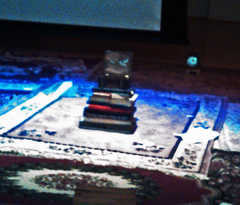 “La Boîte ” itself–the box–was on stage, atop a stack of books. It was used, I think, to give a deeper meaning to the title. The box was glued to the books, which were hollowed out. At one point, each of the actors took turns putting a foot into the box. The box swallowed their legs, almost up to the knee, which signified to me that “The Possessions of La Boîte” are the characters and their lives, not simply the letters that the director found and from which she devised this poetic and evocative performance essay.