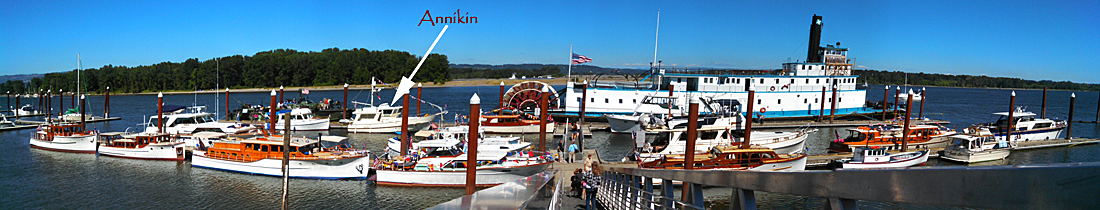 We entered our first boat show–the St. Helen’s Maritime Festival–July 25 & 26. Since Annikin is a “plastic” boat–the term wooden boat owners use when refering to fiberglass boats–we entered in the “Contemporary Classic” and “Cruising” categories. We didn’t win anything, of course. But we learned a better approach in case there’s ever a next time. The two-part secret is, first, to tie up right in the middle of the dock and, second, to invite viewers on board and tell them your cruising stories.