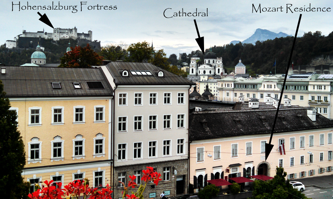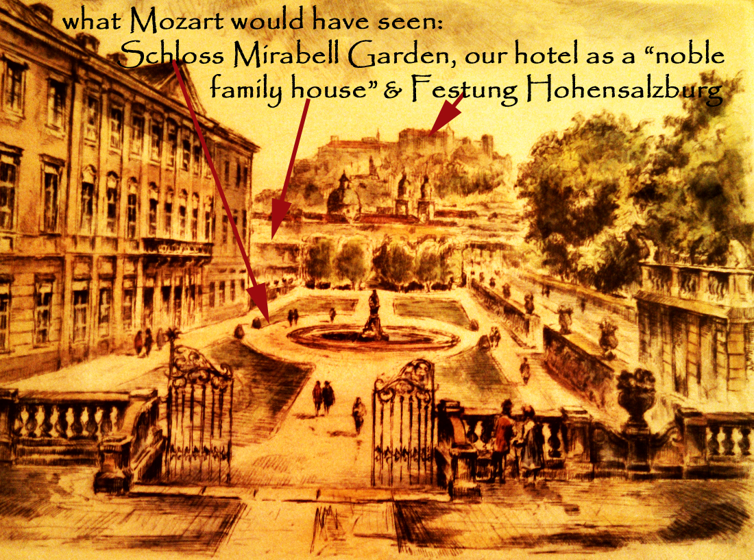 It was perfect: we stayed at the Bristol Hotel. The photo on the left shows the view from our small balcony. The hotel has been in business only since the 1890s, when it was the first “electricity hotel”– but the foundation of the original structure was laid by Paris Londron, one of the more famous of the Prince-Bishops of Salzburg, in 1619. It was remodeled many times during the nearly three centuries that it was the “home of several noble families.”