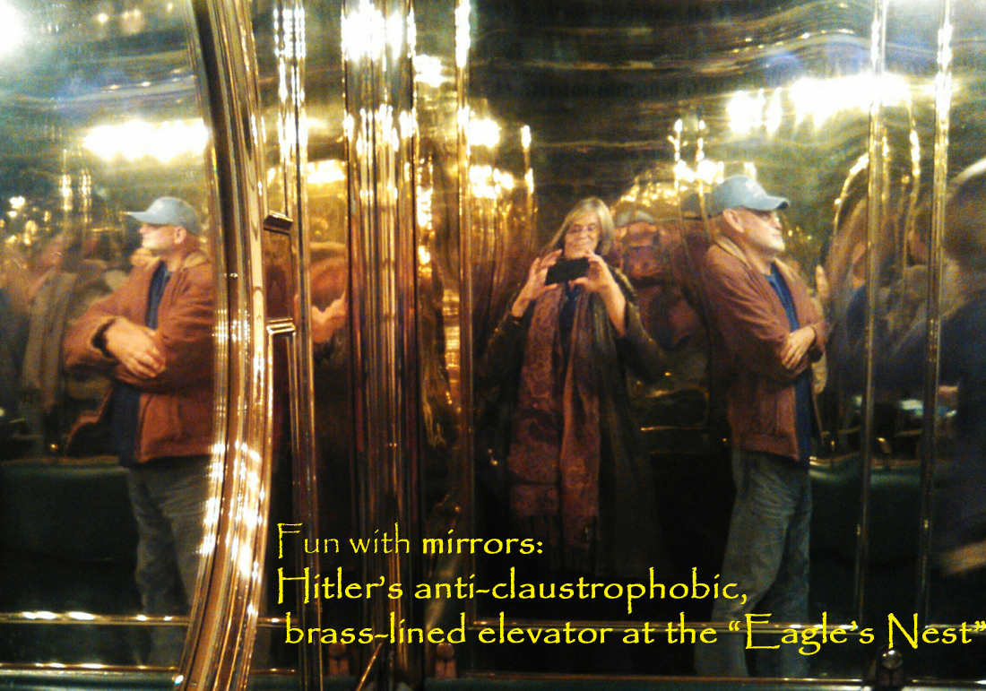 Eagle’s Nest. Hitler’s favored command center was Obersalzburg, much lower in altitude. The bus slowed down as the guide pointed it out. As we looked at the dramatic white shape of Festung Hohensalzburg off in the distance, framed by two alpine peaks, I could imagine Hitler sitting in his study, looking at the vista outside his window, thinking, “Ach, so—this is mine, all mine.”
