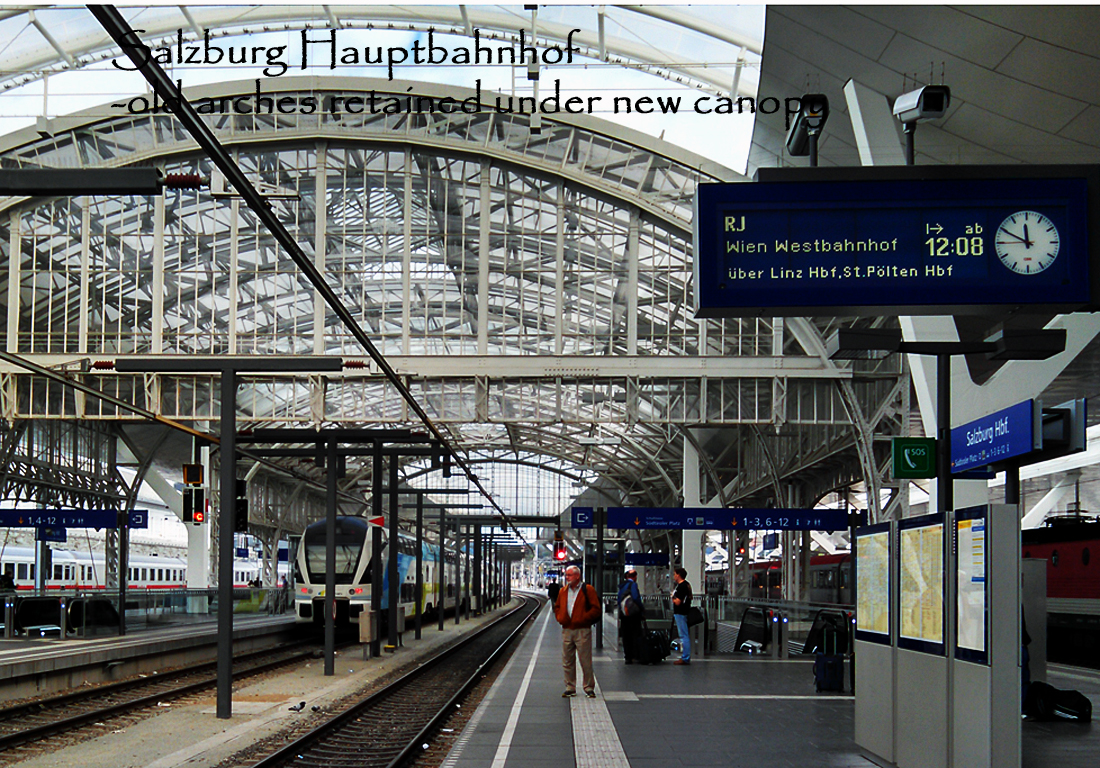 Since we travel light: one wheeled bag and one light carry-on each, we enjoyed the half-hour walk to the Hauptbahnhof to await our train to Vienna. The station is very modern, but we appreciated that they had left the 19th century, cast-iron canopy arches in place over the platforms.