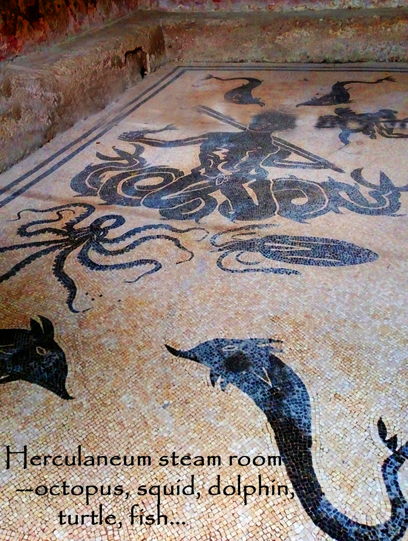 Herculaneum came later–jumping ahead a few centuries, Vesuvius demolished it in, I think, 79AD. It was an upscale seaside resort for wealthy Romans. By the way, Maria Elena also told us that only gods, heroes (like Hercules, who were related to gods), soldiers who died in battle, and victorious athletes were depicted in the nude. Aphrodite/Venus was the only goddess depicted in the nude until after the Christian era.