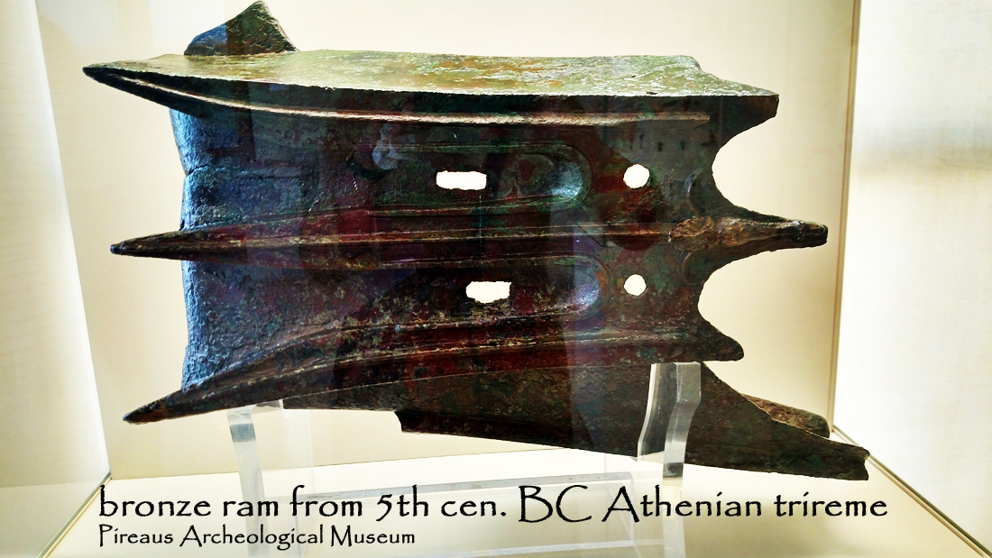 Themistocles realized that “walls of wood” meant “boats.” He set about building the fleet of 196 triremes that defeated the Persians at the battle of Salamis—which took place just outside the harbor at Pireaus. 2021 will mark the 2500th anniversary of that victory in 480 BC Themistocles’ triremes were vastly outsized and outnumbered by the ships of the Persian fleet. But the triremes were nimble and they featured the first weapon specifically designed for naval battles: the bronze ram.