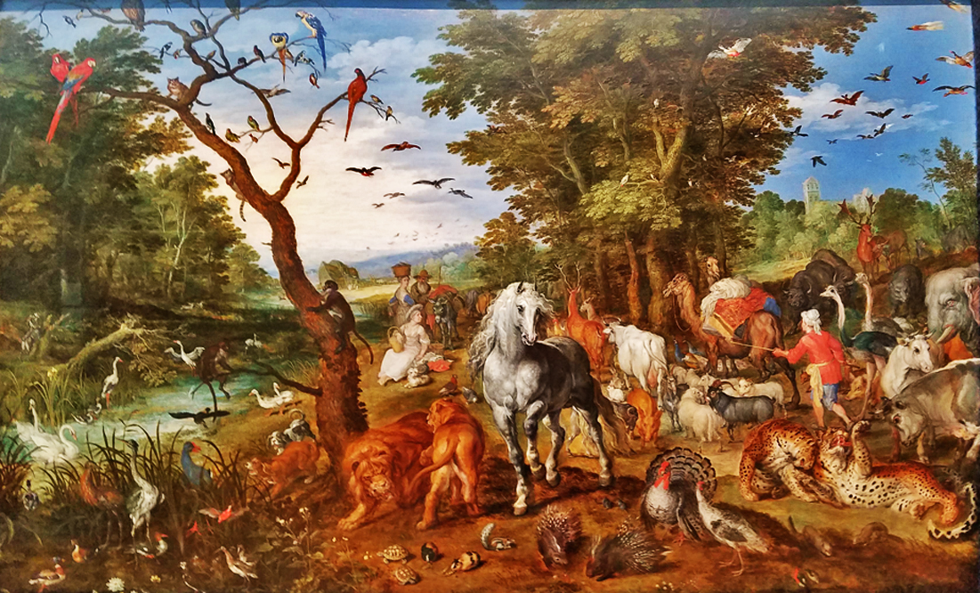 The architecture is still magnificent. The landscaping has matured, even more beautiful than before. The Art collection took our collective breath away. We were there from 10 to 5—opening to closing—and we didn’t see all of it. Baroque and pre-Baroque holdings fill many galleries. I’ve always loved Flemish still life paintings and quiet interiors with a figure or two and a skillful rendering of sunlight coming through the window. I don’t see any ark in this 1613 work by Jan Breughel the Elder. Wouldn’t you love to have all these creatures come to your picnic?