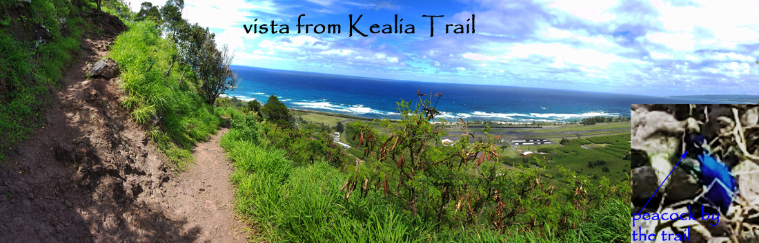 A few days later we drove to the North Shore and hiked part way up the Kealia Trail. It began as a smooth dirt trail, but transitioned to increasingly larger, uneven rocks it got higher and steeper. I always like to finish what we start; this time I was glad Gary said we should turn back when we did. It was much more difficult going down than coming up. As an extra bonus, he spotted a bright turquoise flash among the trees below the trail. It turned out to be a wild peacock.