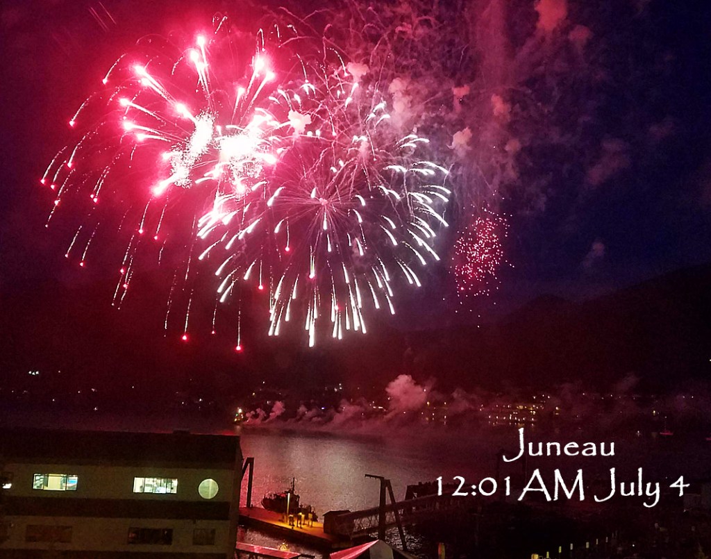 I’m skipping photos of the ferry we boarded to go from Skagway to Juneau on July 3. Suffice it to show that, because it stays light so long that far north, Fourth of July fireworks begin at 12:01AM on July 4. Our hotel room faced the bay off Juneau, which was the only place in Alaska where fireworks were permitted this year (because of fires that filled the air with smoke), so we were awakened by the noise and enjoyed the show.