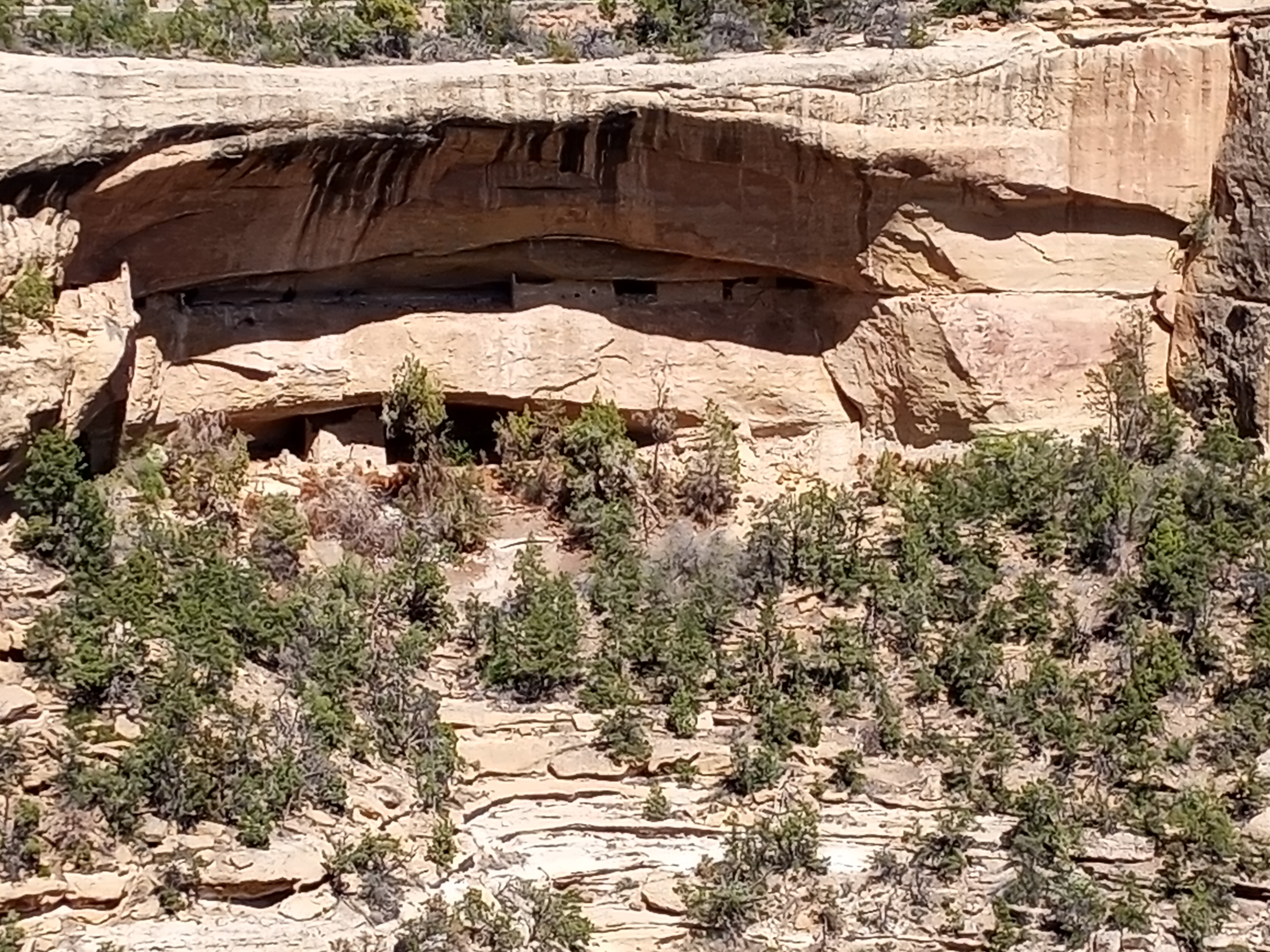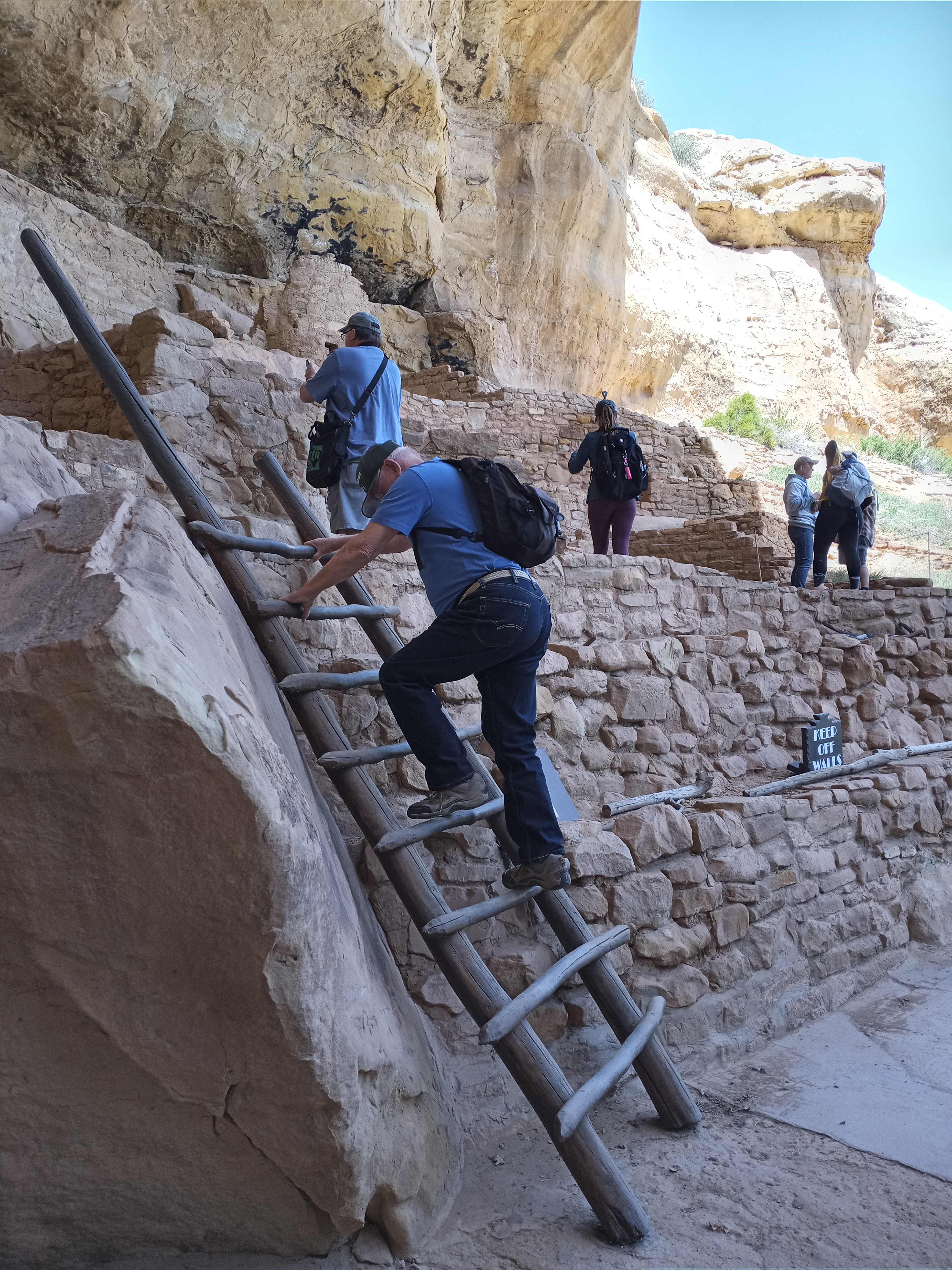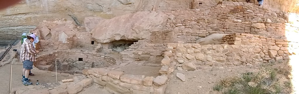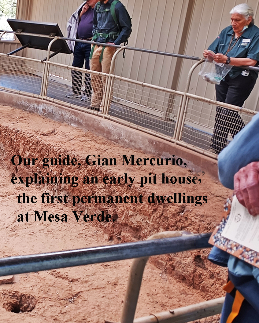 Part 1 covered April 26-29. On April 30, we traveled south-east to another incredible site that was enhanced by humans: Mesa Verde, CO. It wasn’t far, so we arrived in plenty of time for our four-hour “700 Year Tour” –which was even better than we anticipated. Our tour guide was Gian Mercurio, who’s been immersed in the history of Mesa Verde for decades. She’s worked at Mesa Verde for 17 years as an Interpretive Ranger and Museum Curator; plus, there were only five of us on the tour that afternoon. Gian explained how they’ve determined, using tree ring data, that several nomadic tribal groups lived at Mesa Verde from about 600 A. D. to 1300 A. D. These included people of the Basketmaker III Period and Pueblo Periods I-III. Katie was our very knowledgeable Navajo driver, originally from Oklahoma. All of us enjoyed the interactive discussion as we progressed through the tour.