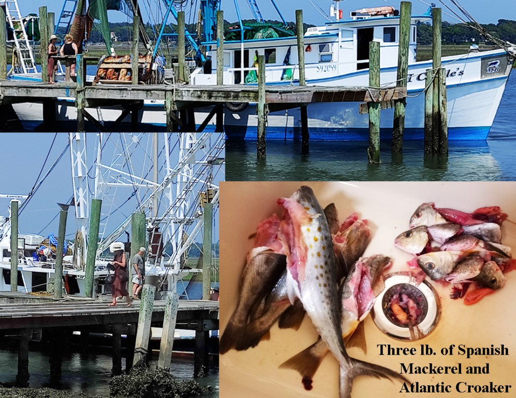 That evening, we made it to Ben and Ruth’s lovely new place and walked into the nearby town of Carolina Shores for a delightful fish dinner. The next day, we explored nearby beaches and found a nice outdoor restaurant for lunch right by the channel that leads from the Intracoastal Waterway, on which we cruised intermittently, from 2004 to 2006. A fishing boat docked while we were there.