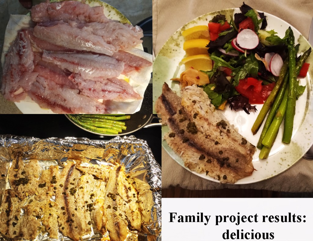 It took me a couple of hours to skin and mostly debone the fish while Ben and Ruth looked up some recipes. They prepared the dinner–which tasted as good as it looks in the photo. Also, I understood “Spanish mackerel” but didn’t catch what the second kind of fish was. Ben finally figured out that it was Atlantic Croaker. Impossible to debone when raw, it flaked easily with a fork when cooked.