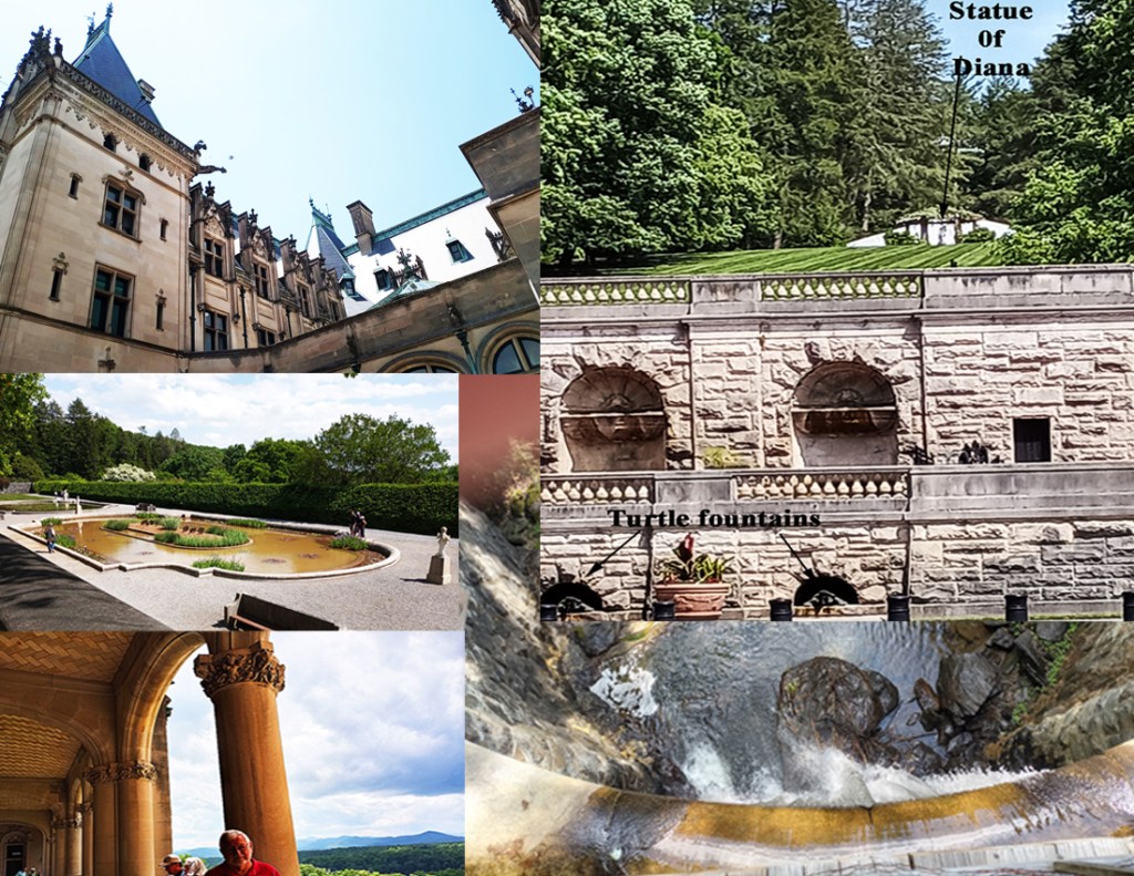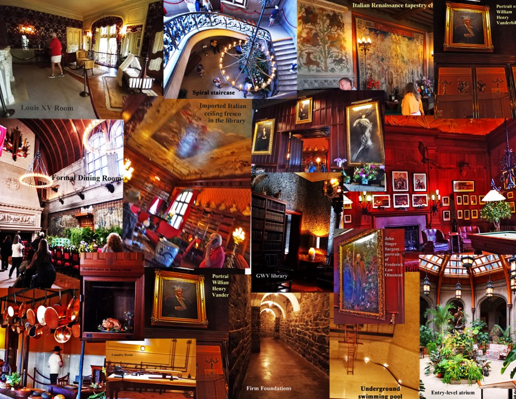 This collage of indoor views shows just how well this mansion was set up to entertain up to, I think, about 30 elegant guests with a variety of interests. The Louis XV room at the upper left was Ethel Vanderbilt’s bedroom and where she gave birth to their only child, a daughter. The daughter and her husband inherited the estate and their two children (both daughters, I think) were also born in this room. I think you can see the captions on most of the other snapshots. The estate was added to the National Register of Historic Places many years ago and is now a non-profit organization still managed by members of the Vanderbilt family.