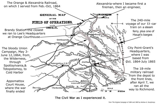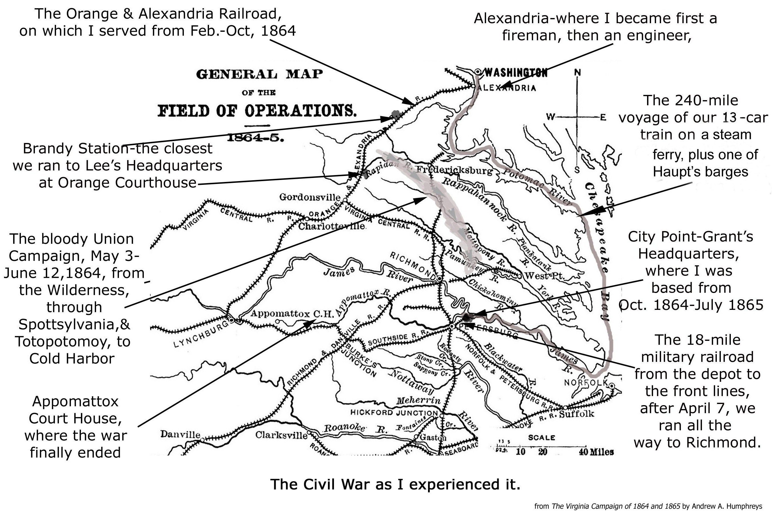 John served in the US Military Railroad of Northern Virginia from February 1864 through July 1865. He saw a very small fraction of the overall conflict, but he was there when it ended and only a few miles from precisely where it ended. This map was in one of my father’s West Point texts, published in 1937.