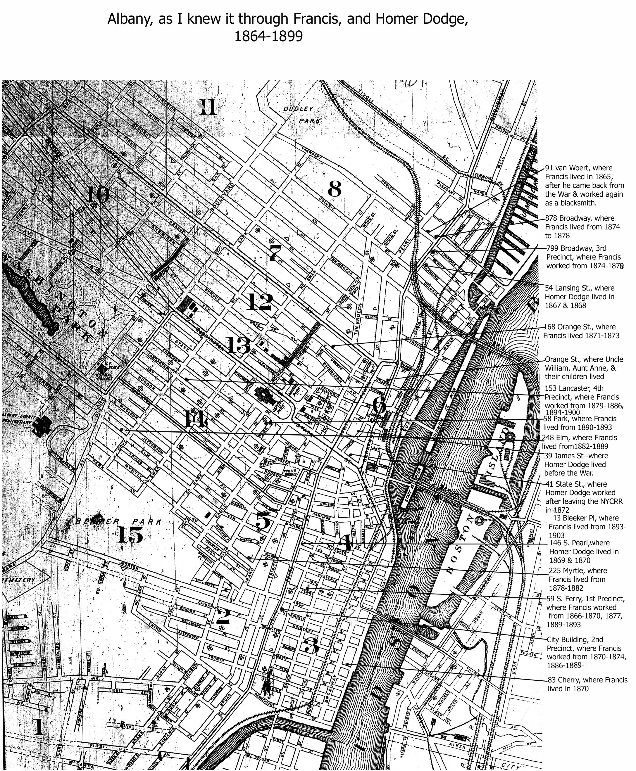 Francis was cast out by their father in 1856. He found an uncle in Albany and settled there. In later years, John visited Albany many times. This fuzzy enlargement of South Albany, from a map in the 1901 Albany City Directory, conveys a general idea of where Francis and his family and John’s friend Homer Dodge lived and worked.