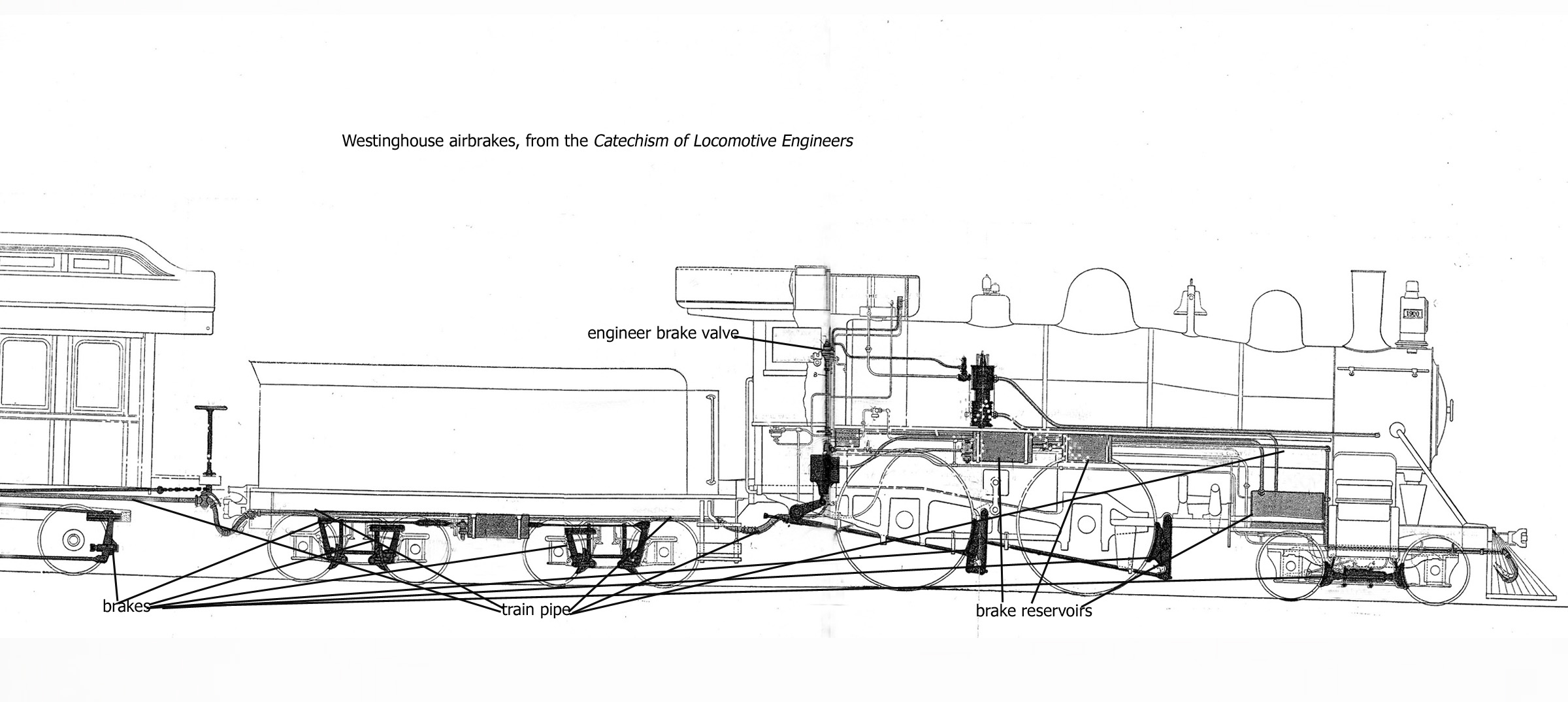 I was particularly intrigued by the brilliant simplicity of the Westinghouse air-brake system: the brakes don’t release until the system is fully charged to the correct air pressure. If a car should somehow break loose, the system loses pressure and the brakes lock automatically so that the runaway car stops. The diagram in the book is difficult to read.
