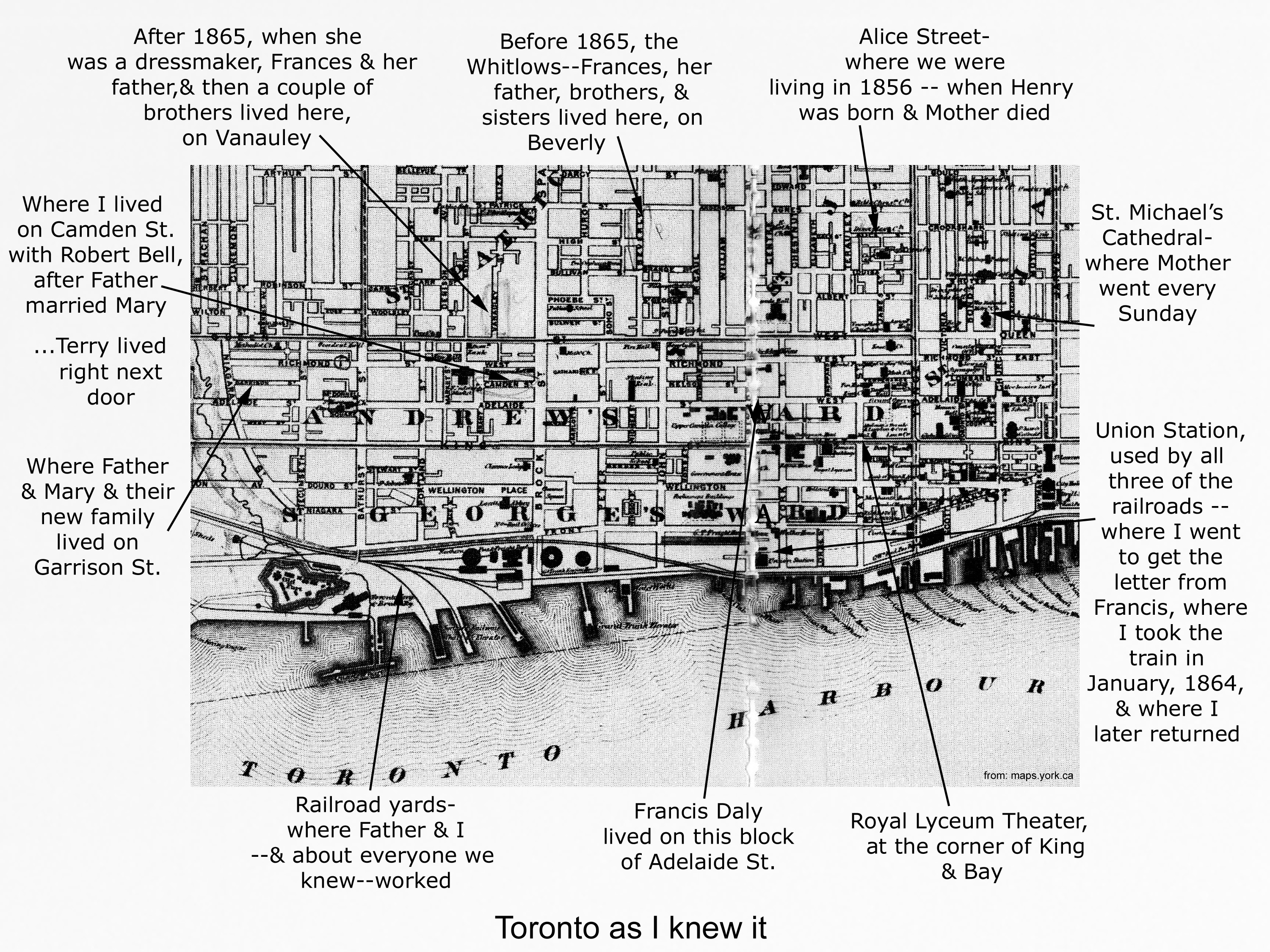 The Bailey brothers arrived in Toronto with their parents around 1846, when Francis was five, John two. I first discovered this 1878 map in Toronto: No Mean City, by Eric Arthur. Later I found it on-line at maps.york.ca. This annotated version shows where John, his family, and various friends lived in close proximity to the Toronto waterfront and the Western Yards that played such an important role in his formative years.